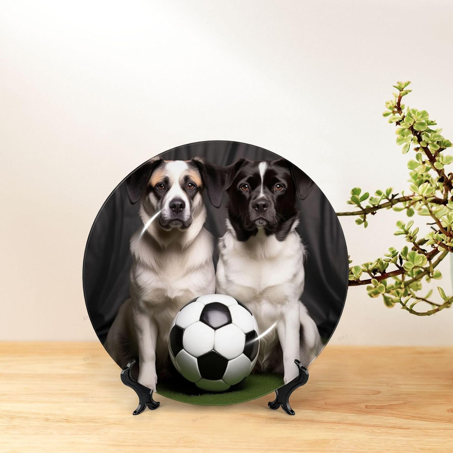gokays decorative platedo you feel that your table is monotonous? Then use our decorative plate to add a little fun to the monotony of life.featuressize - 6 inch diameter;7 inch diameter;8 inch diameter;10 inch diametermaterial - ceramic design - Dogs with Soccer Ball Football package - 1 x ceramic decorative plate, 1 x stand, 1 x pothookwhy choose gokays decorative plates?advantageas manufacturers we follow current trends and bring you the latest home fashion. Salad plates ideal for placement at home or in the office. Traditional porcelain making technology, fine workmanship. Ceramic dinner plates is a good gift for family and friends.convenient to useour dinner plates rack for display has 2 ways to use, you can just place the bracket base on a flat surface first, and then put the plate on it, also you can stick the provided pothook at the back of the plate, and then stick the plate on the wall, you can choose the suitable installation method according to the actual situation.occasionour ceramic ornaments salad plates is a perfect decorative and collection for any niche, table, or mantle at your home. Perfect for your office, home, living room, dining room, playroom, kitchen, cafe, study, studio, club, bar, and others.in a surprise for your family and friends!porcelain dessert plates is a perfect gift for any person in your life. You can give it directly to your lover as mother's day gift/father's day gift/birthday gift/christmas gift/valentines day gift/anniversary gift/wedding gift/housewarming gift/new home gift.start with our funny decorative plate, refresh your rooms!
