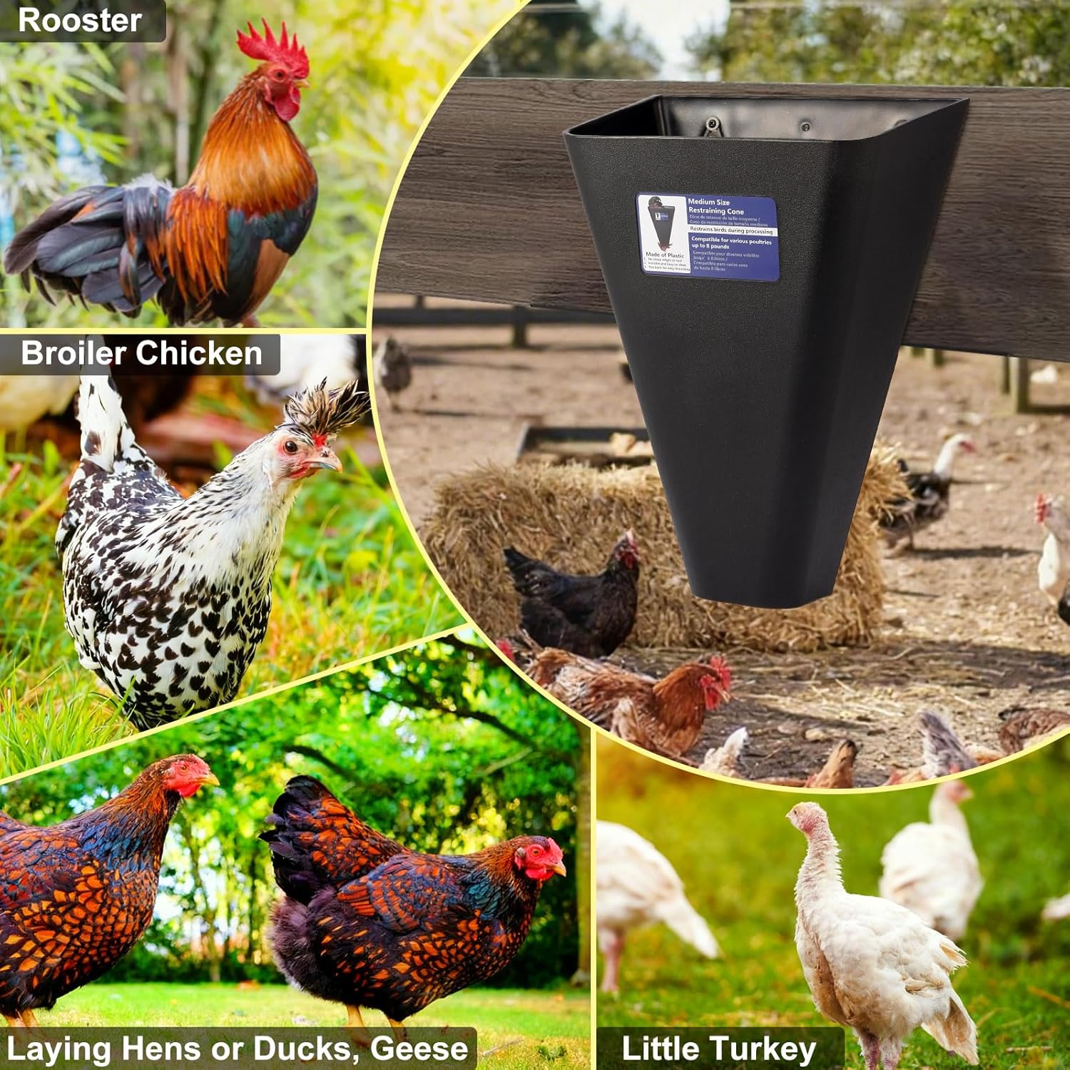 Chicken Cone – Versatile Medium-Sized Poultry Restraining Cone for Safe & Efficient Processing Chicken Cone, a precision-engineered poultry restraining tool designed to streamline your slaughter process while prioritizing safety, durability, and hygiene. Perfect for small-scale farmers, homesteaders, and hobbyists, this medium-sized kill cones for chickens is tailored for birds weighing 2-8 pounds, including Rhode Island Red Hens, dual-purpose chickens, layers, broilers, roosters, and small turkeys. The chicken cone measures 14.5 inches in height, 10.5 inches in length, and 7.5 inches in width.Key Features: 1. Versatile & Optimized Design - Universal Fit: Specially contoured to accommodate medium-sized poultry. This Chicken Cone Medium Size Poultry Restraining Processing Equipment for Butchering, Kill Cone for Chickens Up to 8 Pounds with Flat Back Design, Durable Composite Plastic Integral Molding from Elspezi is a solid piece of thick molded black plastic with rounded edges, "frosted" textured outer skin, smooth inner skin, and no seams. There is no assembly, the all plastic design and smooth inner walls are easy to clean. - Funnel-Shaped Efficiency: The tapered design positions the bird’s head securely at the bottom for quick, humane blood release, minimizing mess and maximizing processing speed. 2. Unmatched Durability - Rust & Corrosion-Proof: Crafted from heavy-duty, industrial-grade plastic, this chicken processing equipment resists cracking, fading, and weather damage—unlike metal that rust over time. - Deformation-Resistant: Engineered with high-toughness material, the chicken killing cone is capable of recovering its original shape following extrusion-induced deformation. 3. Safety First - Our chicken cone for butchering has smooth Edges, Zero Risks: Rounded, seamless surfaces eliminate sharp edges, protecting both handlers and birds during operations. - Secure Mounting: A flat-back design with three pre-drilled screw holes allows easy installation on trees, fences, walls, or workstations.Once mounted, the chicken kill cone stays firmly in place, eliminating wobbling during use. 4. Hygienic & Easy Cleanup - Non-Porous Surface: The seamless plastic interior prevents blood and debris buildup, enabling quick rinsing or sanitizing after each use. This chicken butchering equipment no crevices, no hassle. 5. Meat Quality Preservation - Thermal Insulation: Plastic’s low thermal conductivity (1% of steel) slows heat loss, preventing birds from cooling too rapidly post-slaughter. This helps retain optimal meat texture and freshness while blood drains.Usage Steps: 1. Secure the poultry in the cone. 2. Proceed with the processing of the poultry. 3. Clean the cone after use.Ideal For: Rhode Island Reds, bantams, and other medium dual-purpose breeds. Not recommended for large poultry (e.g., Cornish cross, broad-breasted turkeys) due to chest width limitations.Why Choose Our Chicken Cone? Say goodbye to flimsy metal cones that rust or wooden models that splinter! Our plastic slaughter cone combines practicality with longevity, ensuring a humane, efficient, and clean process every time. Truly excellent poultry farm equipment for chicken catcher kill.Customer Satisfaction Guaranteed: If our chicken supplies product doesn’t meet your expectations, contact us immediately—we’re here to make it right!Upgrade Your Poultry Processing Today—Order Now!