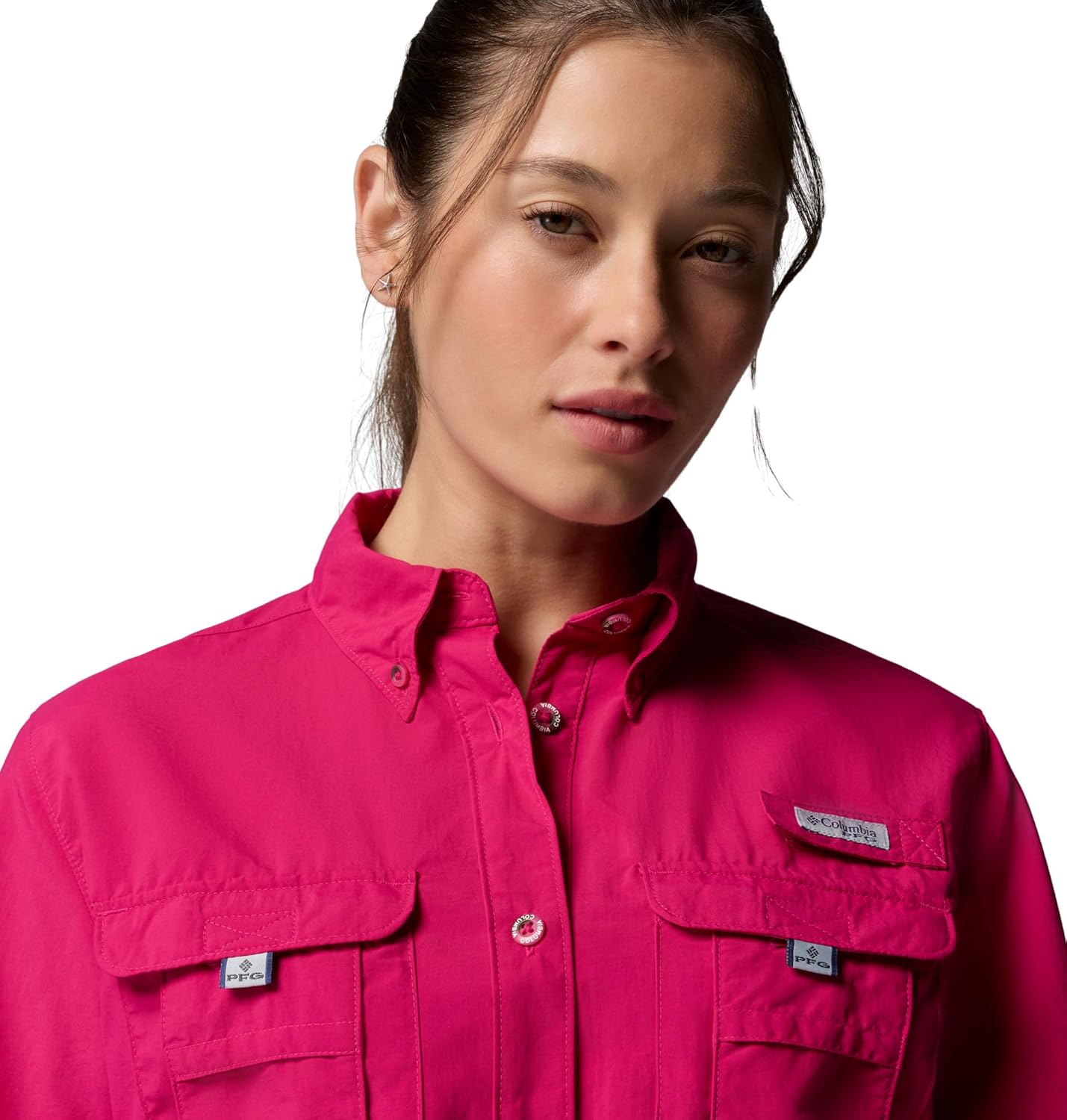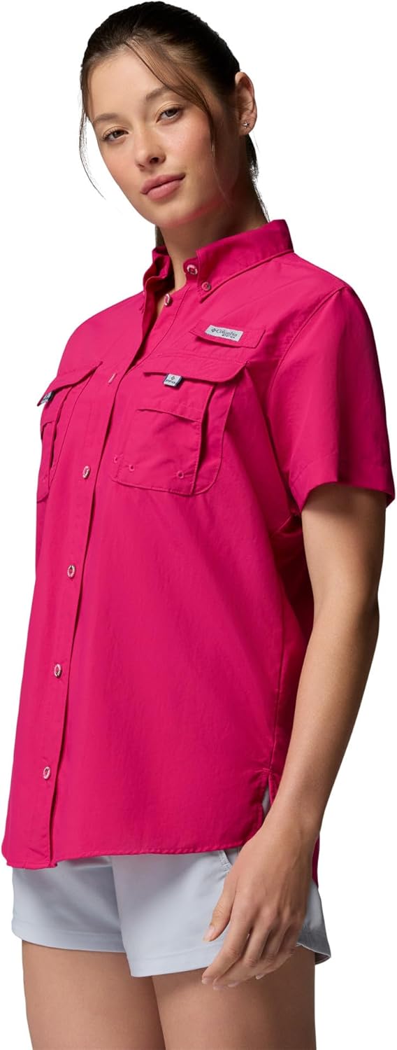 A sun-blocking, quick-drying Columbia PFG women’s shirt for fishing and enjoying the great outdoors. This short-sleeve layer offers cooling vents, multiple pockets, and a rod holder. Columbia offers this shirt in multiple colors and sizes. Extended sizing available. Relaxed fit.