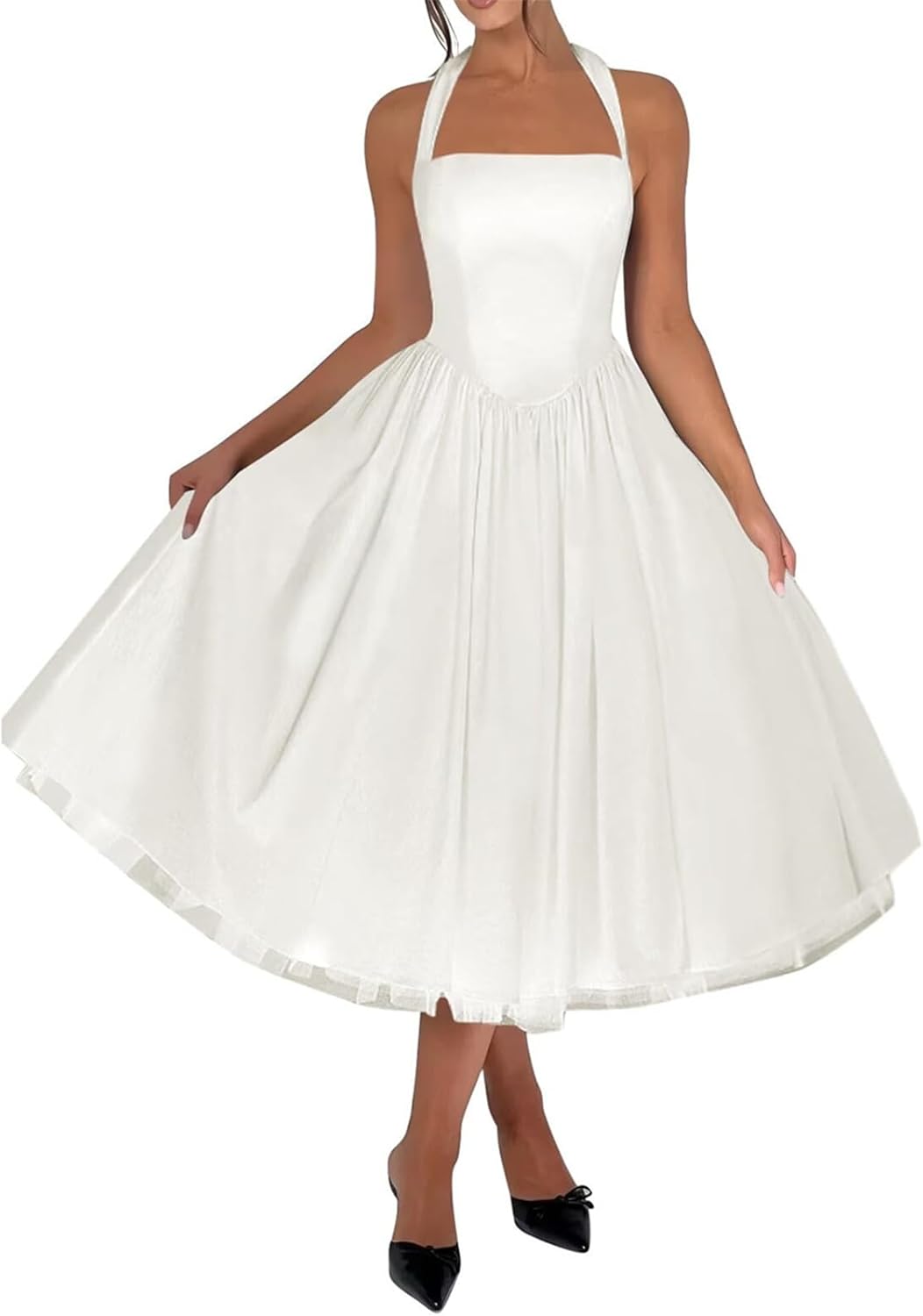 Welcome to Wirunsy We are a professional women's clothing business, we have an excellent team, strictly control every detail, just so that you can perfectly put on a beautiful skirt to participate in every important occasion, I believe we can do better, here you can choose at will! Product Information:Item Name:Wirunsy A Line Satin Prom Dress Halter Neck Tea Length Wedding Guest Party Gowns Midi Ball GownsBack: Sexy Backless ,Corset Lace Up BackNeck: Halter Neckline Sleeve: SleevelessShape: A LineLength: Tea Length Midi LengthSuits for occasion:Homecoming Dress/Cocktail Dress/Night Out Club Dress/Prom Dresses/Evening Dresses/Bridesmaid Dresses/Wedding Party Dresses/Wedding Guest Dresses/Holiday Dresses/Party Dresses/Formal Dresses/Dancing Dresses etc. If you want to customize the size, please send us the following information, we will customize according to your needs! A.Bust _____ inch or ___ cm. B.Waist _____ inch or ___ cm. C.Hips _____ inch or ___ cm. D.Height: _____inch or ___ cm. E.Hollow (collarbone)to floor____ inch or ___ cm. F.Shoulder to Shoulder ____ inch or ___ cm. G.The heel of your shoes: _____inch or ___ cm. H.The date you need the dress____. NOTES: 1. The real color of the item may be slightly different from the pictures shown on website caused by many factors such as brightness of your monitor and light brightness. This is unavoidable, please understand! 2. Please allow a slight deviation of 1-5cm from the measured data.