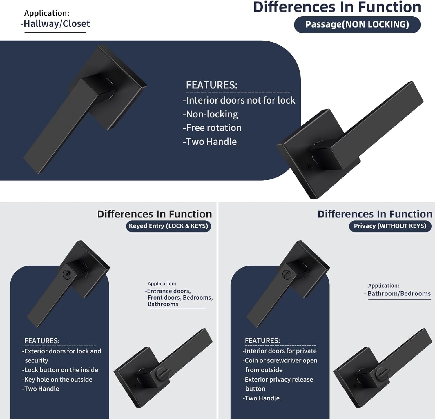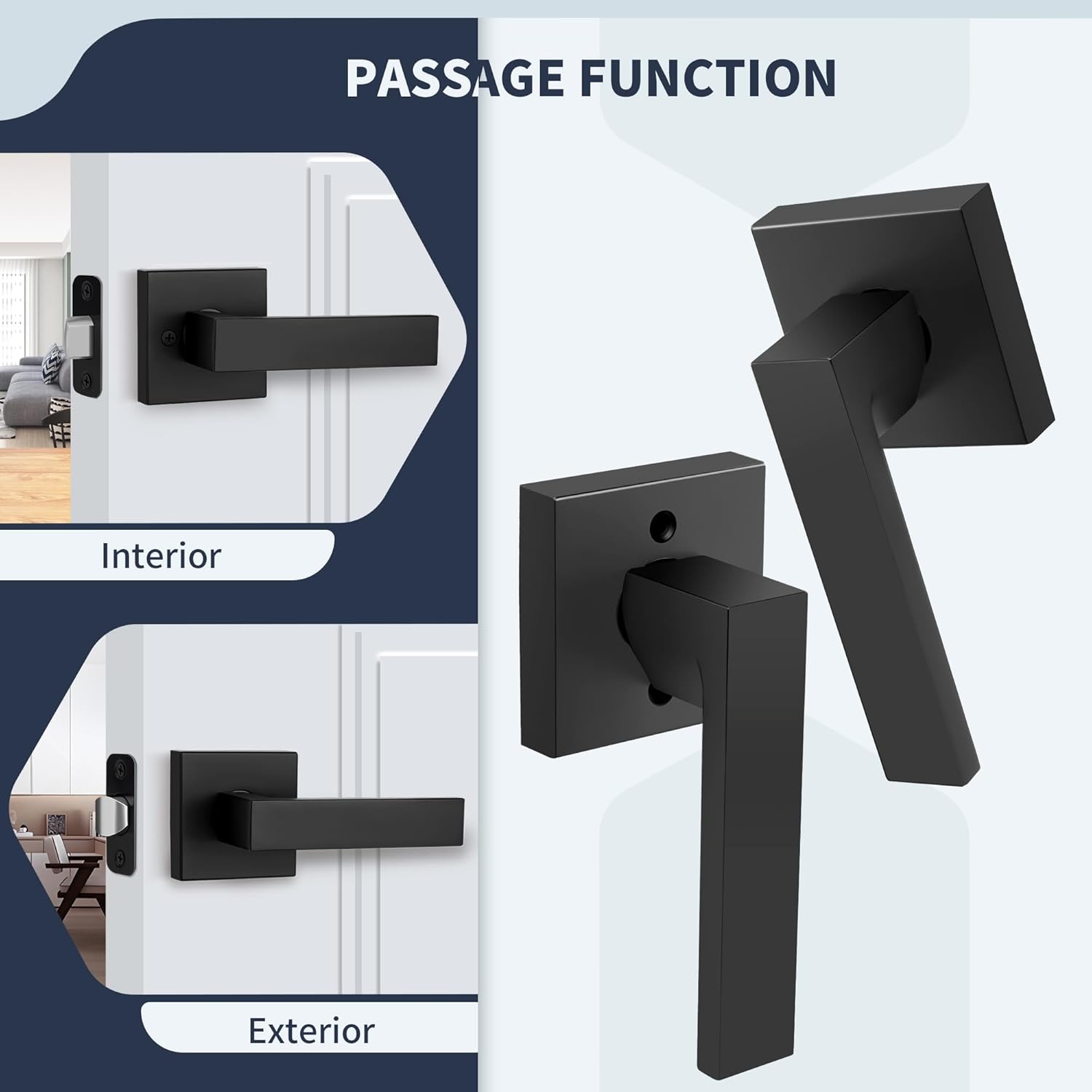 Classic Square Design Door HandleShape: SquareFinish: Matte BlackFeature: Passage Door LeverReversible Lever: Compatible with both right and left-handed doors.Adjustable latch: 60mm or 70mm (2-3/8" or 2-3/4") backset.Door Thickness: 35mm to 45mm (1-3/8" to 1-3/4")Function: The door handle does not have a locking mechanism, allowing for easy access in and out.
