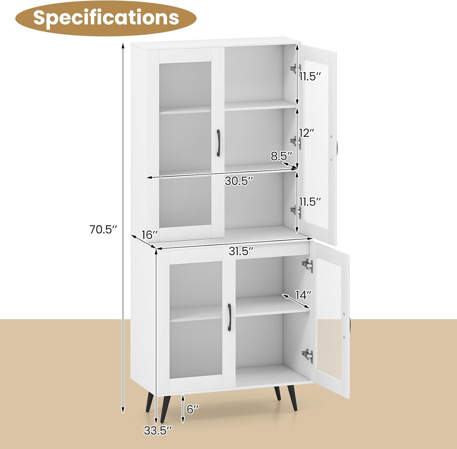 Description: Elevate your kitchen with this chic and sturdy kitchen pantry cabinet! Boasting 2 spacious cabinets with shelving behind, the tall kitchen cupboard offers ample space for microwave, kitchenware, dinnerware, seasons, towels, and tissues. Besides, the 5-position adjustable shelf offers a flexible storage solution, suitable for items in different sizes. The sturdy metal legs with non-slip pads keep it stable, while anti-tipping kits ensure safety. Raised by 6”, cleaning under it is a breeze. Soft-close hinges and convenient handles make daily use effortless. Its modern, versatile design with elegant translucent doors adds style to any room. Transform your space today! Features: Large storage cabinet can provide plenty of space for your bathroom essentials Upper cabinet with 3 shelves for storing plates, cups, bowl, etc. Bottom cabinet is suitable for wines, storage baskets or more Adjustable shelf with 5 available positions adapts to different needs 2 anti-tip kits secure the cabinet to the wall to prevent it from tipping over Raised metal legs with non-slip pads ensure excellent stability Soft close hinges make door opening quiet and smooth Translucent doors add appeal to the storage space Assembly needed Specification: Color: Black/White Material: Engineered Wood, MDF, PC, Metal Product Size: 31.5” x 16” x 70.5”(L x W x H) Dimensions of Shelf in the Top Cabinet: 30.5” x 8.5”(L x W) Height Between Shelf in the Top Cabinet: 11.5”, 12”, 11.5” Depth of Shelf in the Bottom Cabinet: 14” Height from Countertop to Ground: 33.5” Raised Height from Ground: 6” Net Weight: 74 lbs Weight Capacity of Upper Shelf in the Cabinet: 22 lbs Weight Capacity of Bottom Shelf in the Cabinet: 44 lbs Package Includes: 1 x Kitchen Pantry Cabinet 1 x User Manual