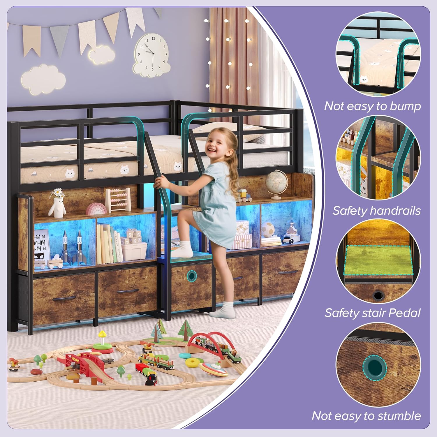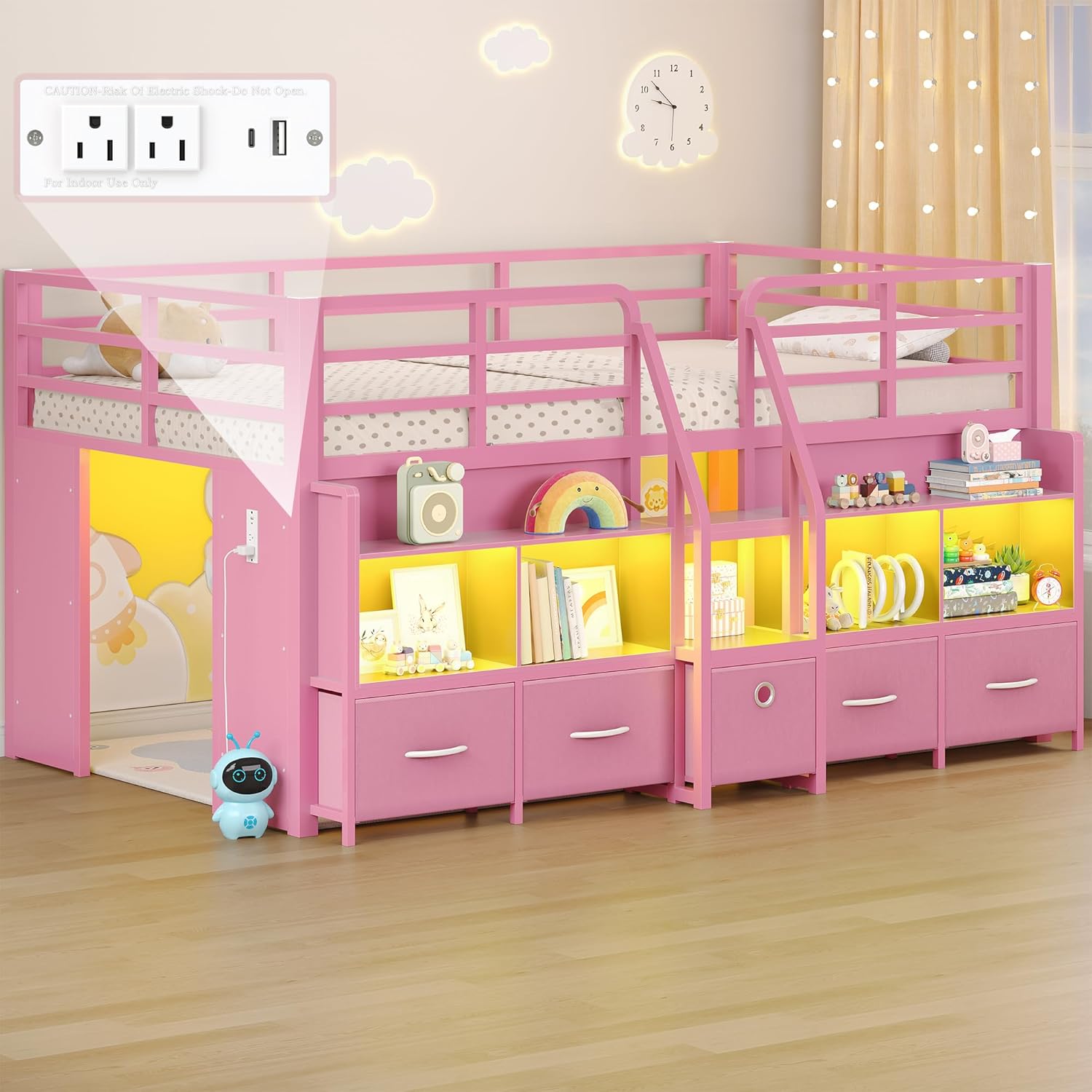 | Additional Features | Kids loft bed with LED Lights and Charging Stations, Low Loft Bed with 5 Drawers & 6 Bookcase, Twin loft bed with Increase the height of the fence to 15.8", Twin loft bed with Safety handrail and Curved angle, loft bed with Spacious Underbed Space |