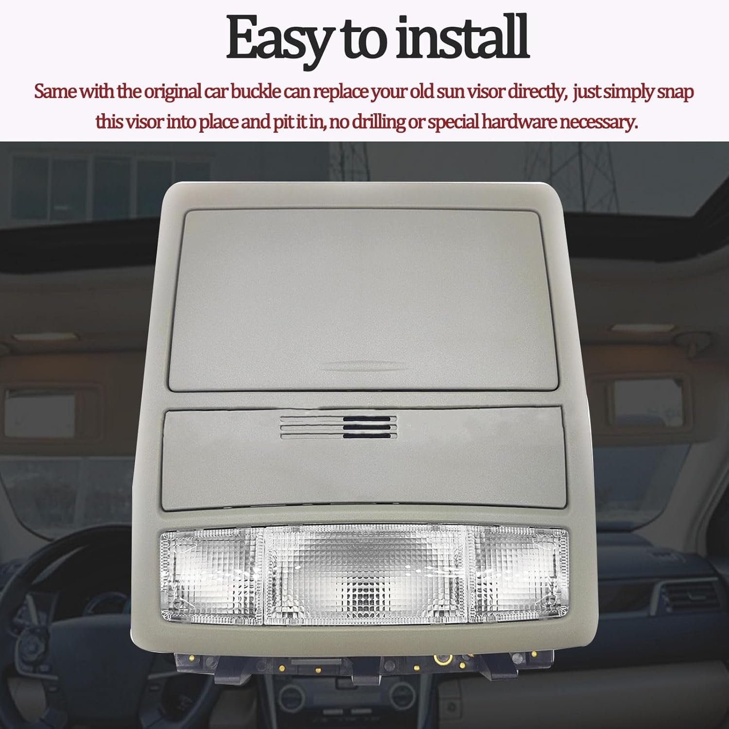 SpecificationName: Overhead ConsoleMaterial: ABS+MetalColours: GrayInstallation: Original replacementSuitable for: for Toyota Camry 2007 2008 2009 2010 2011Features:Experience the convenience of an overhead console for your vehicle with the overhead console. This overhead console comes equipped with a sunroof switch, as well as a reading lamp, offering the perfect blend of practicality and convenience. Upgrade your vehicle with this overhead console today for a safer and smarter driving experience.Package Include: 1x Overhead ConsoleNotes.1.Please make sure your car model is compatible with this product to ensure a perfect match.2.If you are not sure about the item, please contact us before purchase to avoid unnecessary returns, thanks!