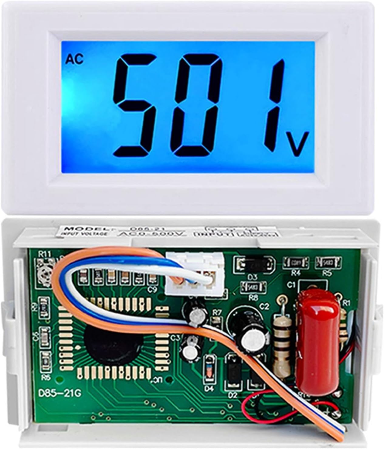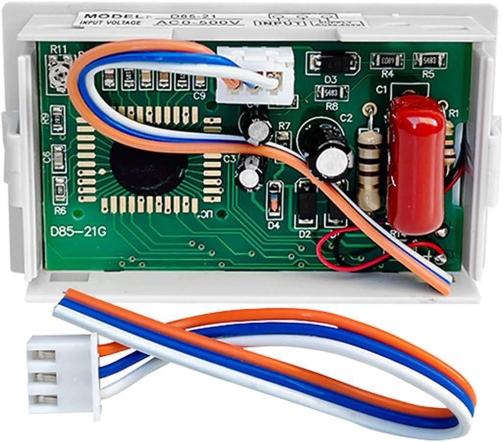 Instrumentation>>DescripeD85-21 is an economical digital measuring instrument specially designed for voltage regulators. The instrument has simple wiring (three wire system), high measurement accuracy, LCD display, clear reading, and backlight. It can clearly see the electrical parameters both in the day and at night. It is a brand-new substitute for the pointer voltmeter.>>SpecificationAccuracy: 1%±2 wordsMeasure Range: AC 0-500VWorking Power Supply: AC 80-500VSize: 70*40*26 mmInstallation Size: 68*38mmColor: WhiteWiring Method: one line input, one line output, and the middle zero line is shared>>Package Included1 × AC voltmeter