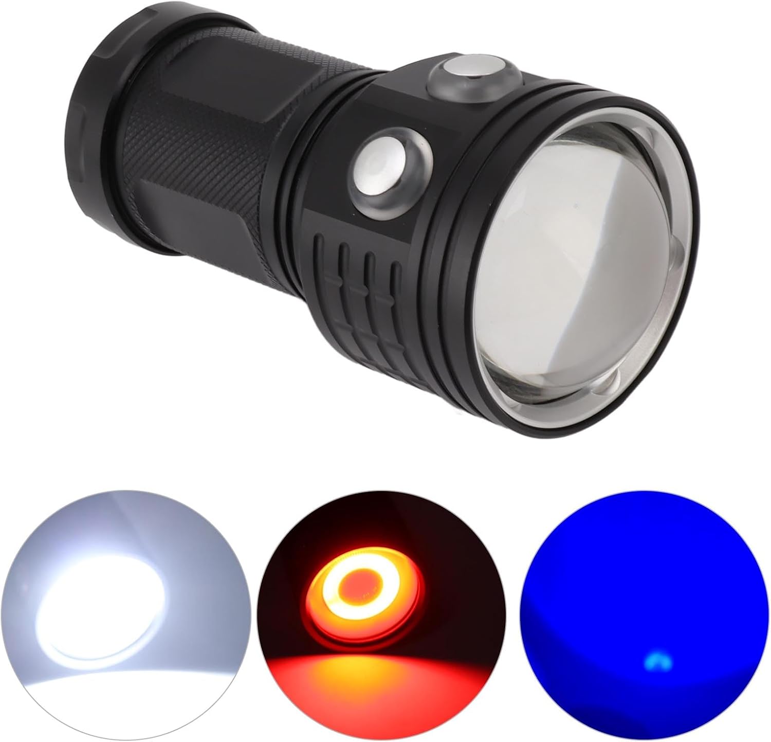 Specification:Item Type: Underwater FlashlightMaterial: Aluminum AlloyProduct Size: Length: Approx. 135mm / 5.3in, Head Diameter: Approx. 65mm / 2.6inPower Supply Battery: 4 × Lithium Batteries (Not Included)Light Source: White Light, Red Light, Blue LightLighting Mode: Key 1 White Light (High Light, Medium Light, Low Light), Key 2 Red Light Is Always On, Red Light Flashing, Blue Light Is Always OnMaximum Dive Depth: 100m / 328.1ftBrightness: 10000LMProtection Grade: IPX8Gross Weight: 574g/20.2ozPackage List:1 × Flashlight Body (Battery Is Not Included)1 × Grip1 × Hex Wrench2 × Spare Rubber Circle1 × Long Screw1 × Column Head1 × Short Screw