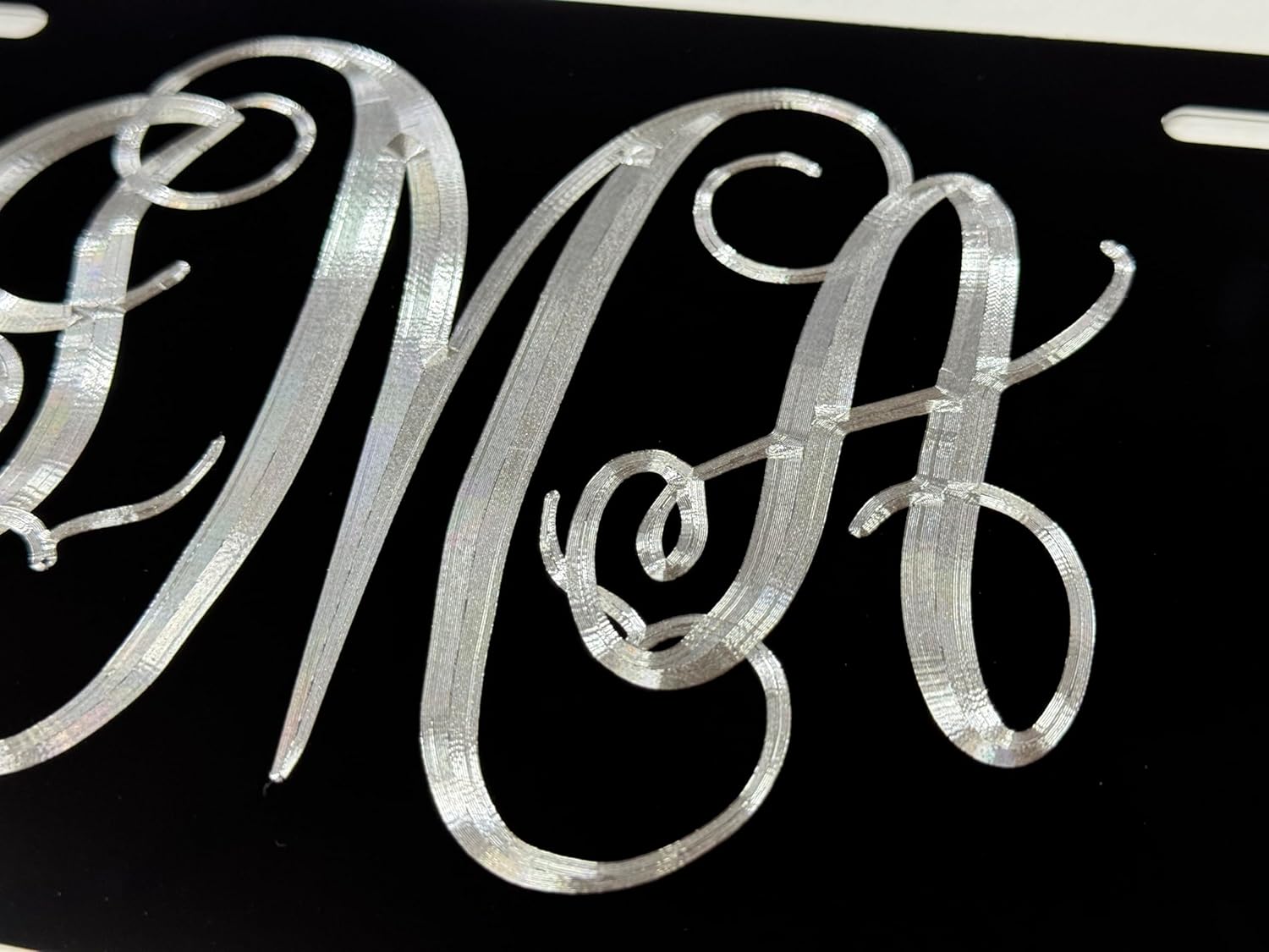 Diamond Etched Products Engraved License Plate. Made in the USA. Are you looking for that traditional engraved look? You know…when the engraving is actually engraved into the material instead of printed or burned? Then you’re looking for Diamond Etched Engraving! Diamond Etching is a specific technique used in engraving designs. Diamond Etched Engraving is also known as “Scratch Engraving” or “Diamond Drag Engraving.” This is because during the engraving process, a diamond engraver drags across the surface of the object to produce the engraved design. Unlike laser engraving or sublimation, the image is cut into the metal in such a way that light reflects off of the design. This creates a depth and brilliance that sets diamond etching apart from any other engraving method. This is by far the most durable engraving style and will never peel or fade like others sometimes do. Simply put, the design will last forever. Plates are made with the highest quality .040 aluminum. They are weatherproof, rust proof and able to withstand the harshest of road conditions. Includes a 3-year manufacturer warranty. Fits any standard size 12" x 6" mount with four mounting slots as pictured.