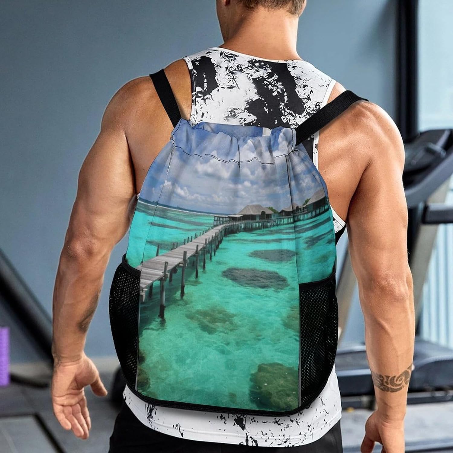 Our premium drawstring bag is the ideal companion for your active lifestyle. Made of premium honeycomb fabric, this pocket is not only durable but also has a comfortable textureA major feature of this Maldives Scenery drawstring gym bag is the wet/dry separation design. Whether you are coming back from a sweaty workout or traveling in the rain, you can easily separate wet clothes or shoes from dry essentials such as electronics, documents or cosmetics. This innovative design keeps your items neatly organized and protectedWith a large zipper opening, it is very simple to access items. The zipper design conforms to the usage habits of most people and can be opened and closed smoothly and easily. You can easily and quickly get what you needThe sturdy structure of this sports bag is another feature. The edges of the shoulder straps are carefully processed, which makes it more resistant to heavy objects than ordinary bags. This ensures that it can accompany you in all sports and adventures without worrying about damageOur Sports Drawstring Backpack pocket also has a large capacity. It can hold a variety of items, from clothes and shoes to iPads, books, keys, ID cards, cosmetics and wallets. It is suitable for various occasions, such as traveling, going to work, fitness, etc. No matter where you go, this pocket can meet your storage needs